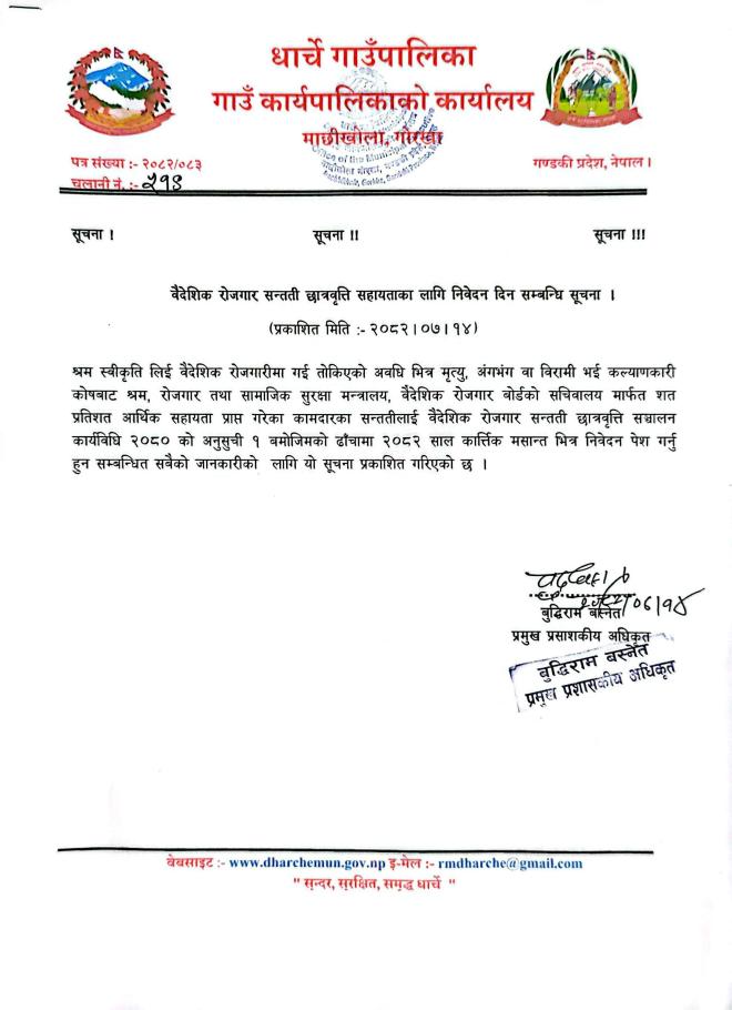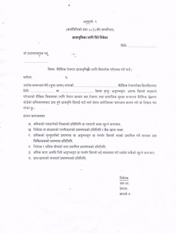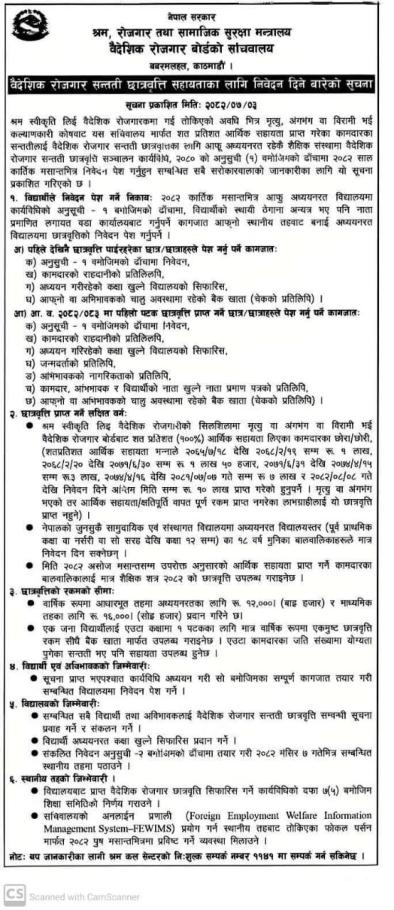 वैदेशिक रोजगार सन्तती छात्रवृत्ति सहायताको लागी निवेदन दिने सम्बन्धी सूचना ।