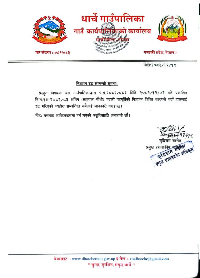 विज्ञापन रद्ध गरिएको सम्बन्धी सूचना ।