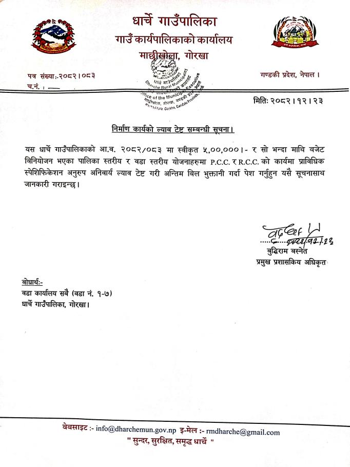 निर्माण कार्यको ल्याब टेस्ट सम्बन्धी सूचना ।