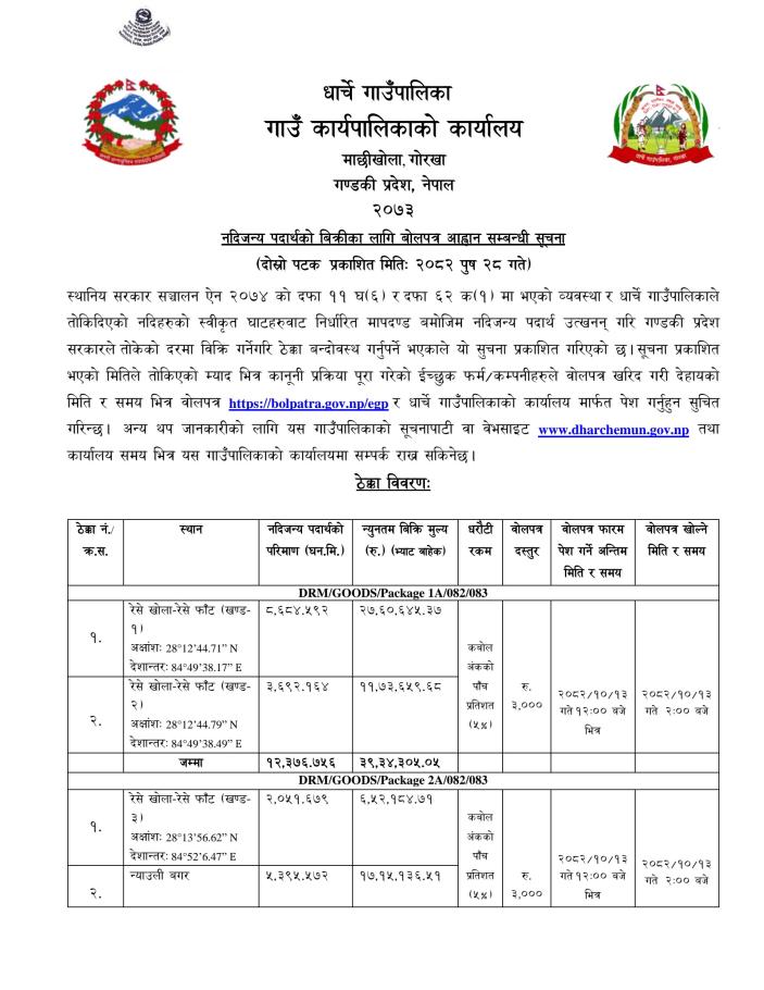 नदिजन्य पदार्थको बिक्रिका लागि बोलपत्र आव्हान सम्बन्धी सूचना ।
